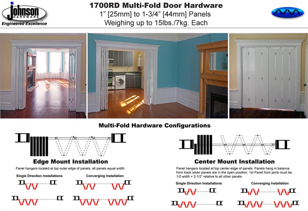Johnson's 1700RD Multi-folding or Room Dividing Door Hardware is designed to light weight door panels or shutters in residential or light commercial interior applications. The 1700RD is 'top hung' hardware, all door weight is suspended from the top track therefore does not require any bottom tracking. The 1700RD allows door panels to be removed or installed without dropping the track. The 1700RD features a jump proof box track track with positive pivot lock, 4-wheeled hanger guides, adjustable bottom pivot and a floor bracket with an adjustable bottom pivot socket. Track lengths are available up to 16'.